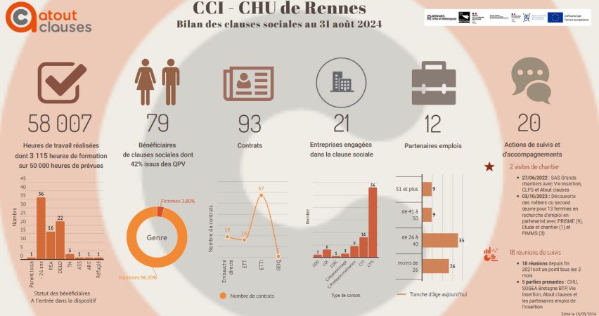 Cette réunion à l’initiative du maître d’ouvrage le CHU et représenté par Mme JOLIFF a réuni pendant 3 ans et demi le CHU, ATOUT clauses, Vie Insertion, SOGEA Bretagne BTP et les partenaires de l’emploi et de l’insertion tous les 2 à 3 mois afin d’évoquer la mise en emploi de chaque salarié en parcours d’insertion.*