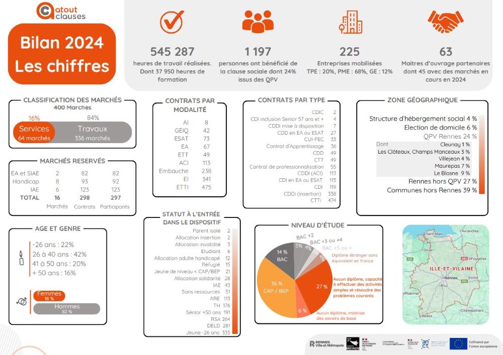 Grâce à la mobilisation de 63 maîtres d'ouvrage partenaires, le dispositif a permis à 1 197 personnes en insertion professionnelle d'avoir un emploi et de réaliser des formations. Parmi elles, 24 % étaient issues des Quartiers Prioritaires de la Ville de Rennes.